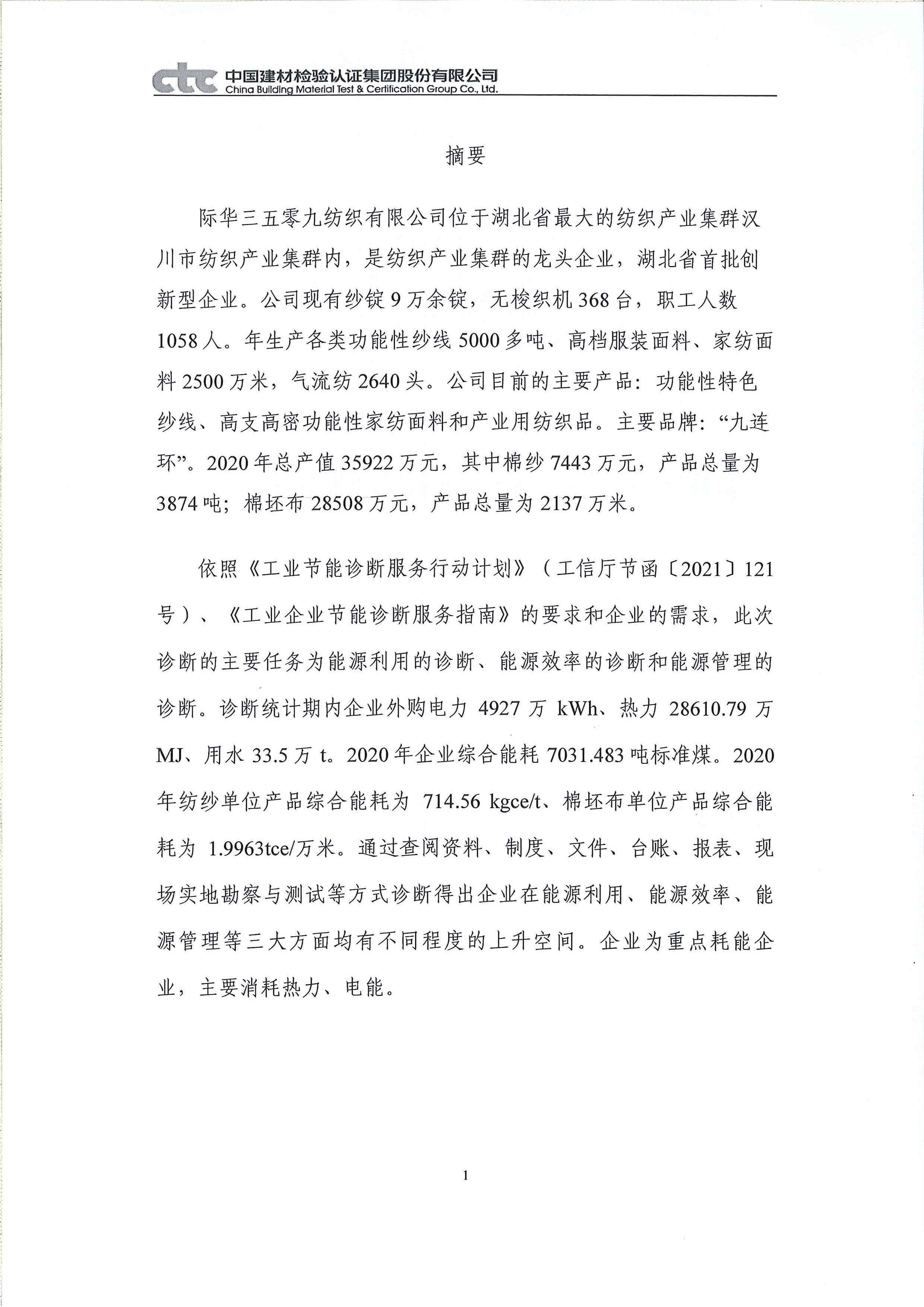 【概要描述】際華三五零九紡織有限公司節能診斷報告